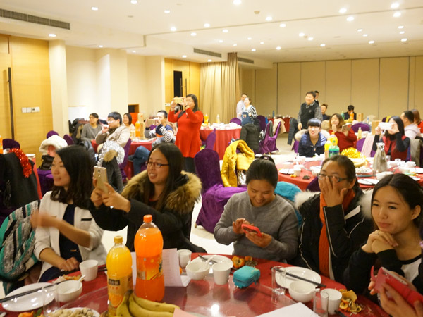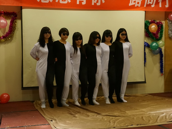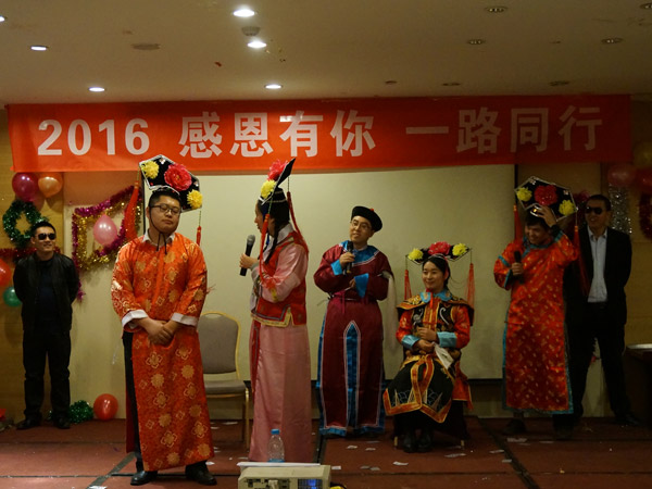 晚會上的清宮戲也是奪人眼球。英文推廣部的《皇帝選妃》和外貿營銷部《甄嬛后傳》讓我們過足了癮。楊康和王天雄拋開自己的個人形象,把后宮大總管演繹的惟妙惟肖。除了一水的美女嬪妃,大帥哥曲經理的客串也為節目增色不少。平時大家都忙于工作,很少有才藝展示的機會,沒想到我們貌不驚人的黃昊竟然能夠一口氣說出一溜的繞口令,和有名的節目主持人華少相比,絲毫不會遜色。