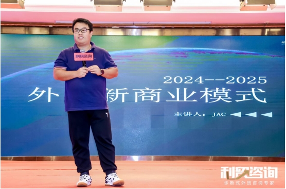 隨后,利貿咨詢創始人JAC帶來了題為“外貿新商業模式”的精彩分享。JAC老師以其豐富的經驗和獨到見解,深入剖析了當前外貿行業的新趨勢和新機遇,直擊企業發展要害,揭秘商業模式的核心要素。他指出,品牌是企業走向世界的名片,是企業在海外市場立足的根本,多維品牌塑造策略在激發企業發展潛能方面具有重要作用。JAC老師詳細介紹了分段式人才培養模式和海外分公司布局孵化的策略。他提到,分段式人才培養能夠解決員工培養周期過長的問題,提高業務團隊的效率和戰斗力;海外分公司的布局孵化,則是搶占全球市場先機的關鍵舉措,能夠幫助企業更好地了解當地市場和文化,建立穩定的銷售渠道和客戶關系。