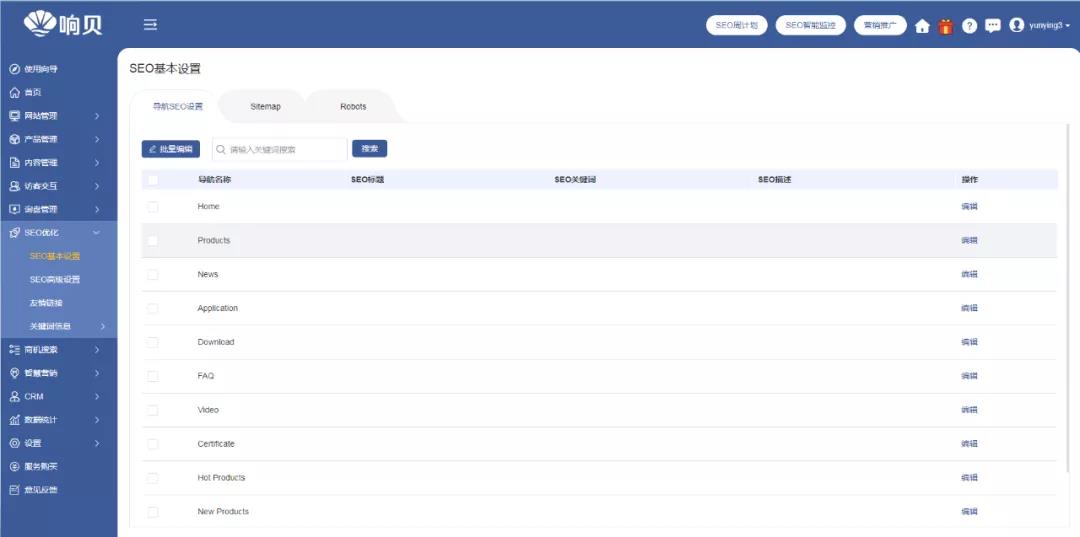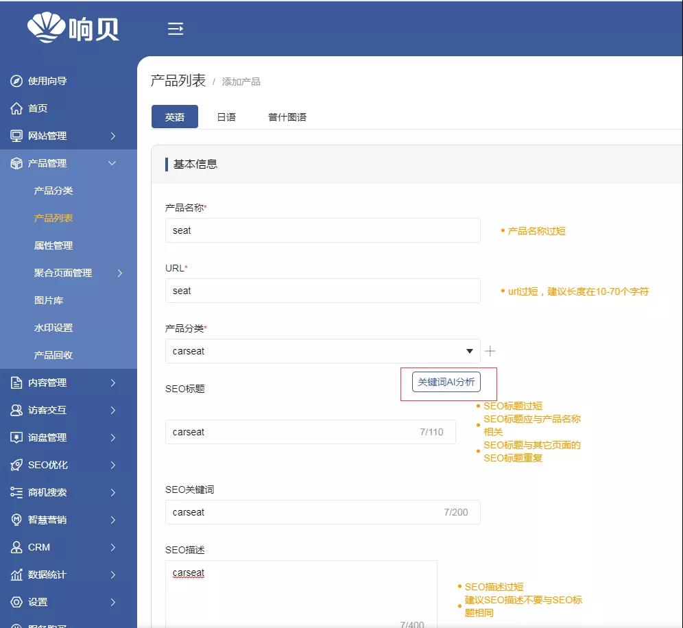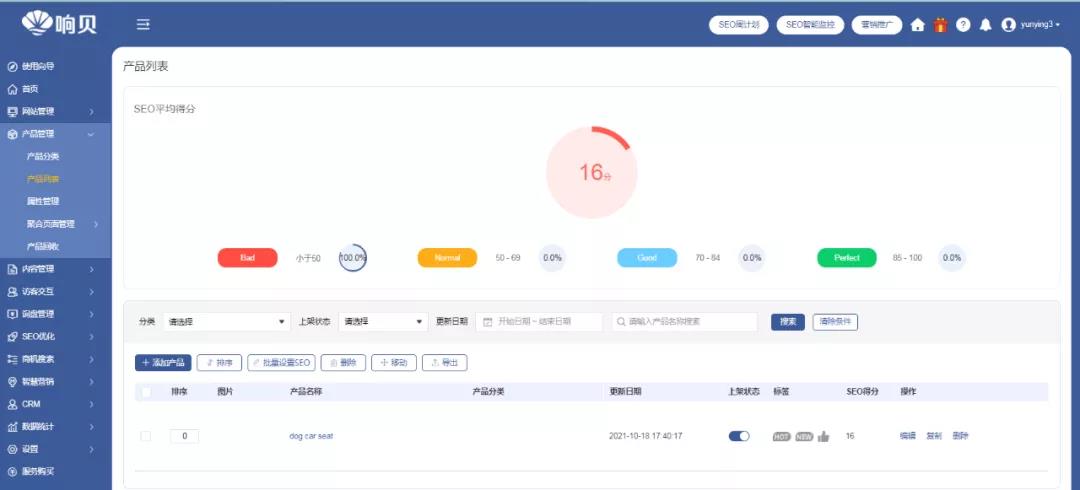 在響貝智慧營(yíng)銷(xiāo)云站,產(chǎn)品列表首頁(yè),還會(huì)對(duì)SEO進(jìn)行評(píng)分。
