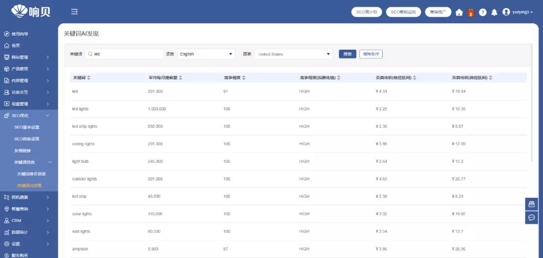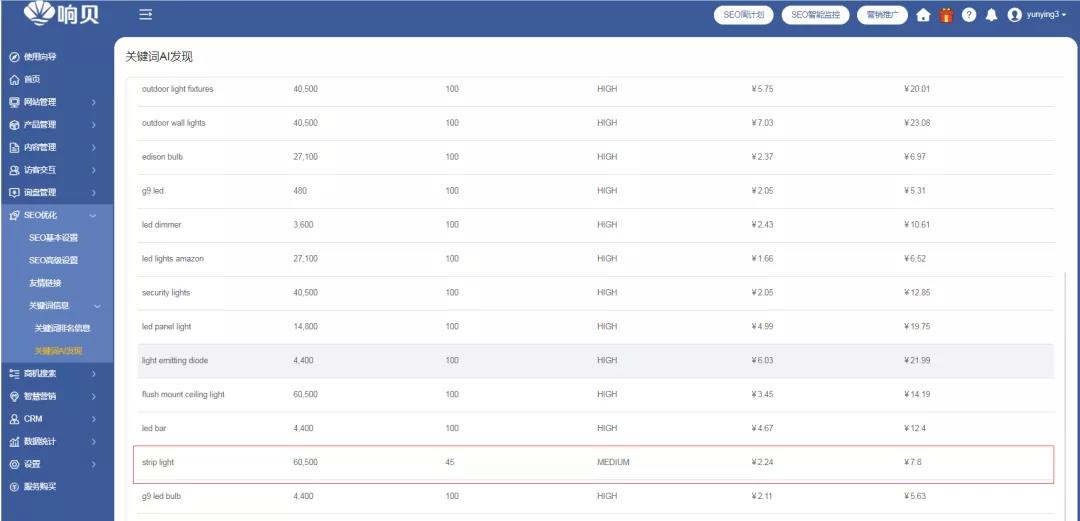 我們?cè)賮?lái)說(shuō)說(shuō)“技術(shù)手段”。 打開(kāi)響貝智慧營(yíng)銷(xiāo)云站,在后臺(tái)看到關(guān)鍵詞AI發(fā)現(xiàn)功能,這里就能夠幫我們“開(kāi)腦洞”,找到更多有用的關(guān)鍵詞。