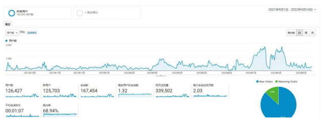 另外在2021年9月—2022年9月這一周期內,網站用戶數達到了126427,會話數167454,網站瀏覽量339502,這組數據說明通過對網站的持續優化,杜高集團的網站咨詢量和轉化量目前已取得了可喜的成績。